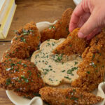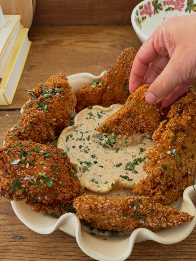 The most insanely delicious, never know it’s gluten free, absolutely addicting crispy fried chicken! Plus, an extra tasty Greek yogurt-based honey mustard sauce for dipping (but, of course, you can serve these up with any dip you love).